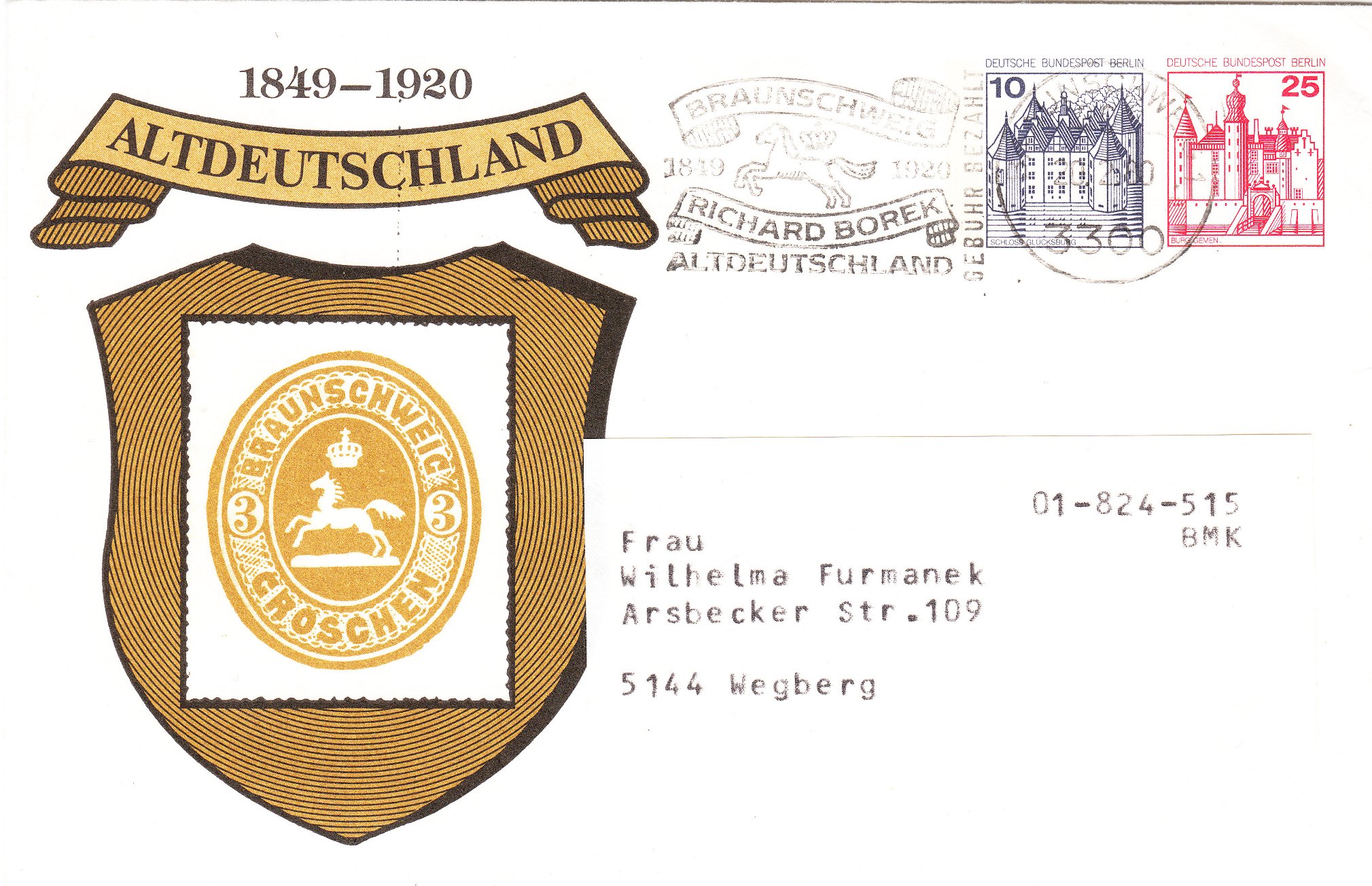 Die in Braunschweig ansässige Firma Richard Borek verschickte am 20.02.1980 solche Umschläge mit Eindruck von zwei Wertstufen der Dauerserie Burgen und Schlösser, Ausgabe Berlin, sowie privatem Zudruck einer ungebrauchten Braunschweig MiNr. 20 als Massendrucksache an ihre Abonnenten bzw. Interessenten. Hier gleich zwei Exemplare, die ich am vergangenen Sonntag beim Tauschtag aus zwei verschiedenen Grabbelkisten ziehen konnte: