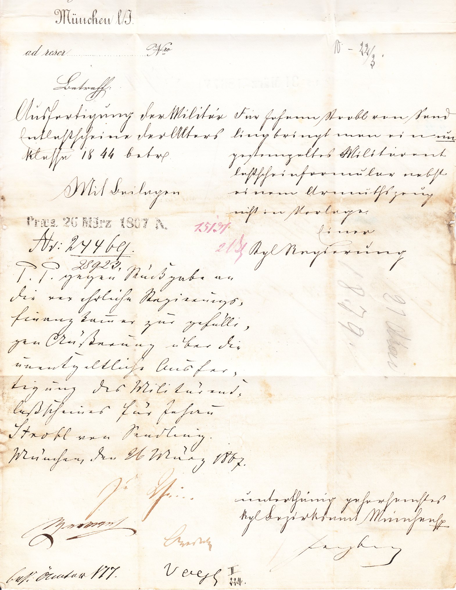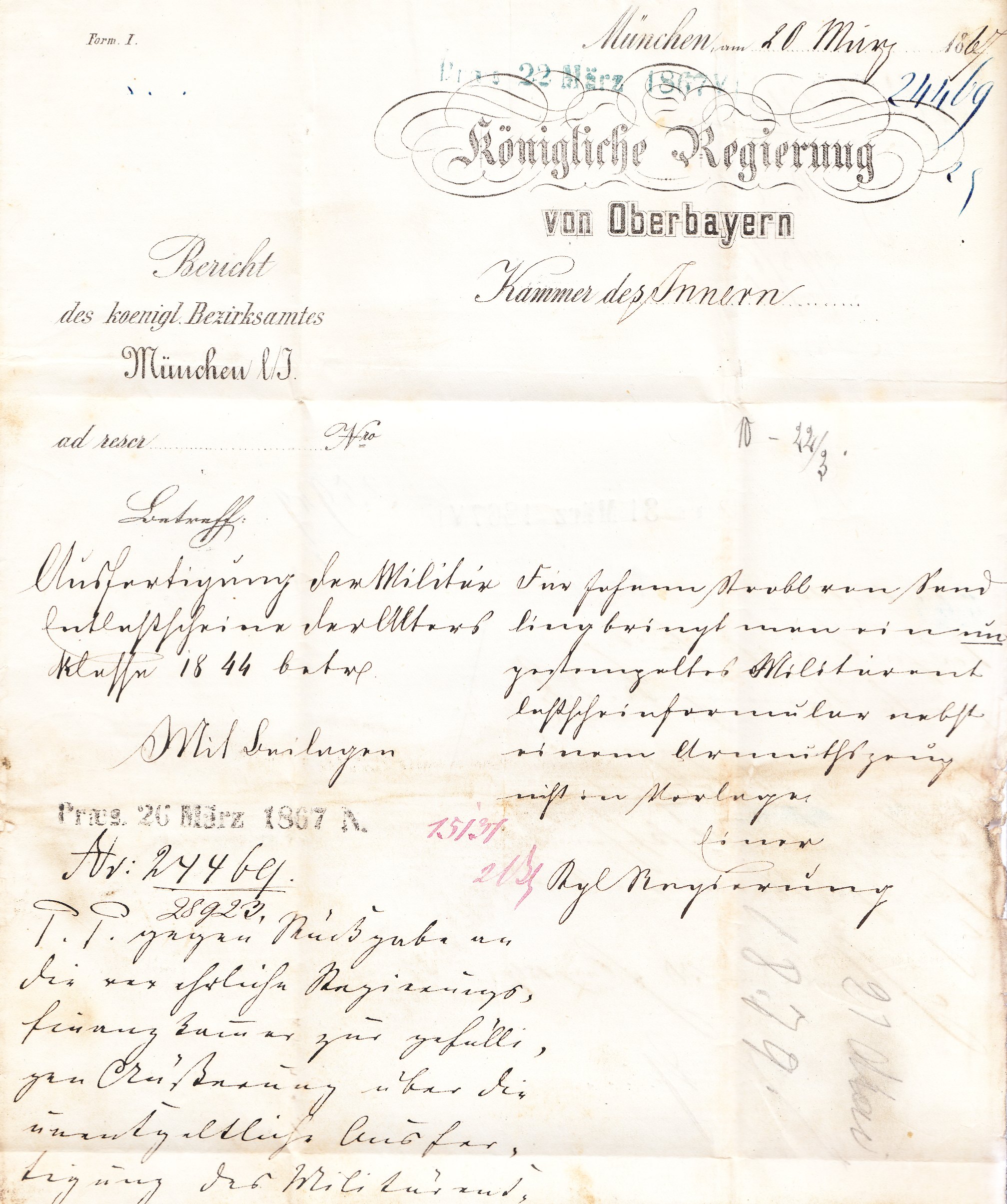 Es handelt sich um ein Antwortschreiben "Vom königl. bayer. Bezirksamte München zur Königl. Regierung von Oberbayern Kammer des Innern in München", hier das Innenleben dieses Beleges: