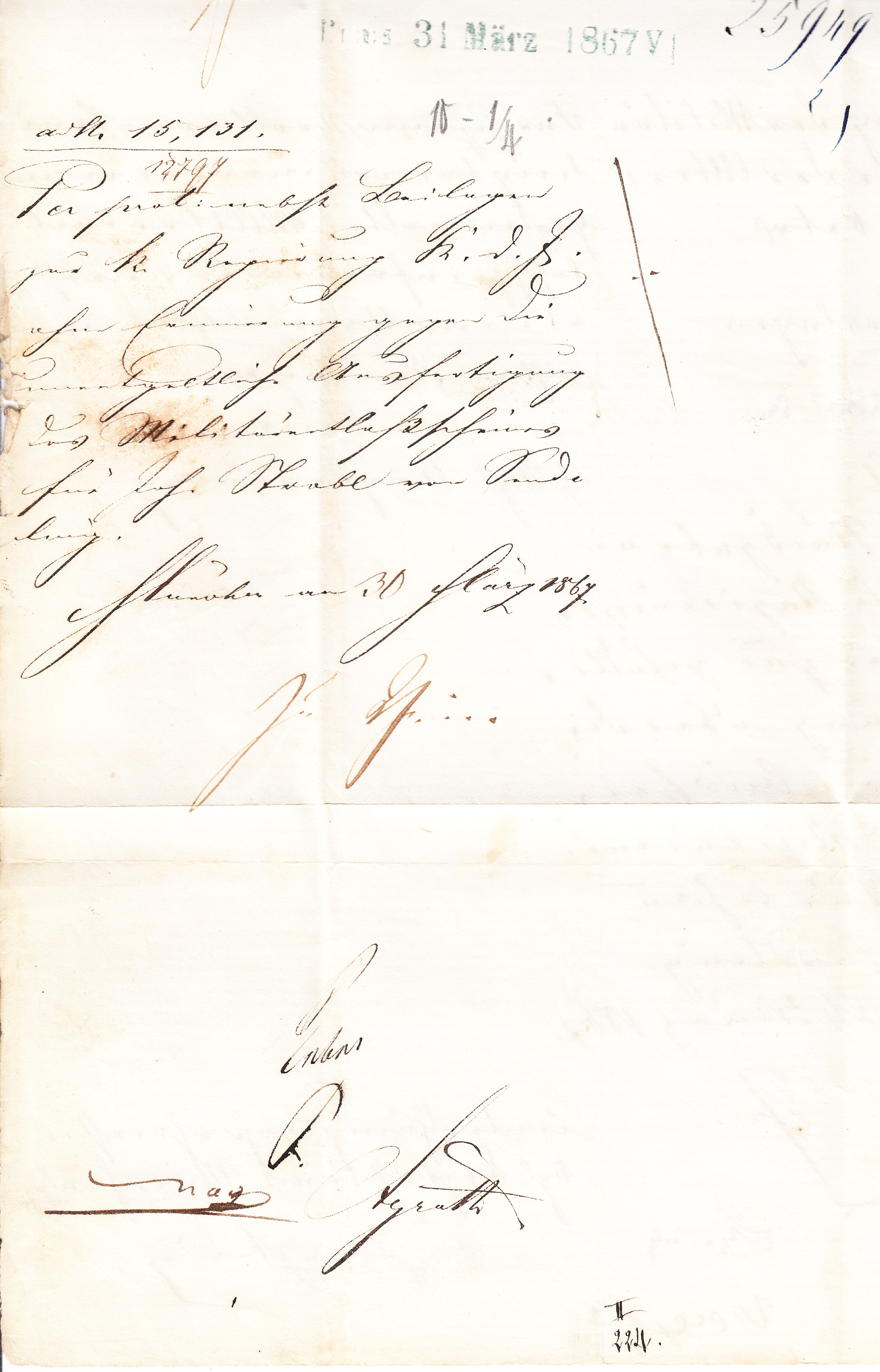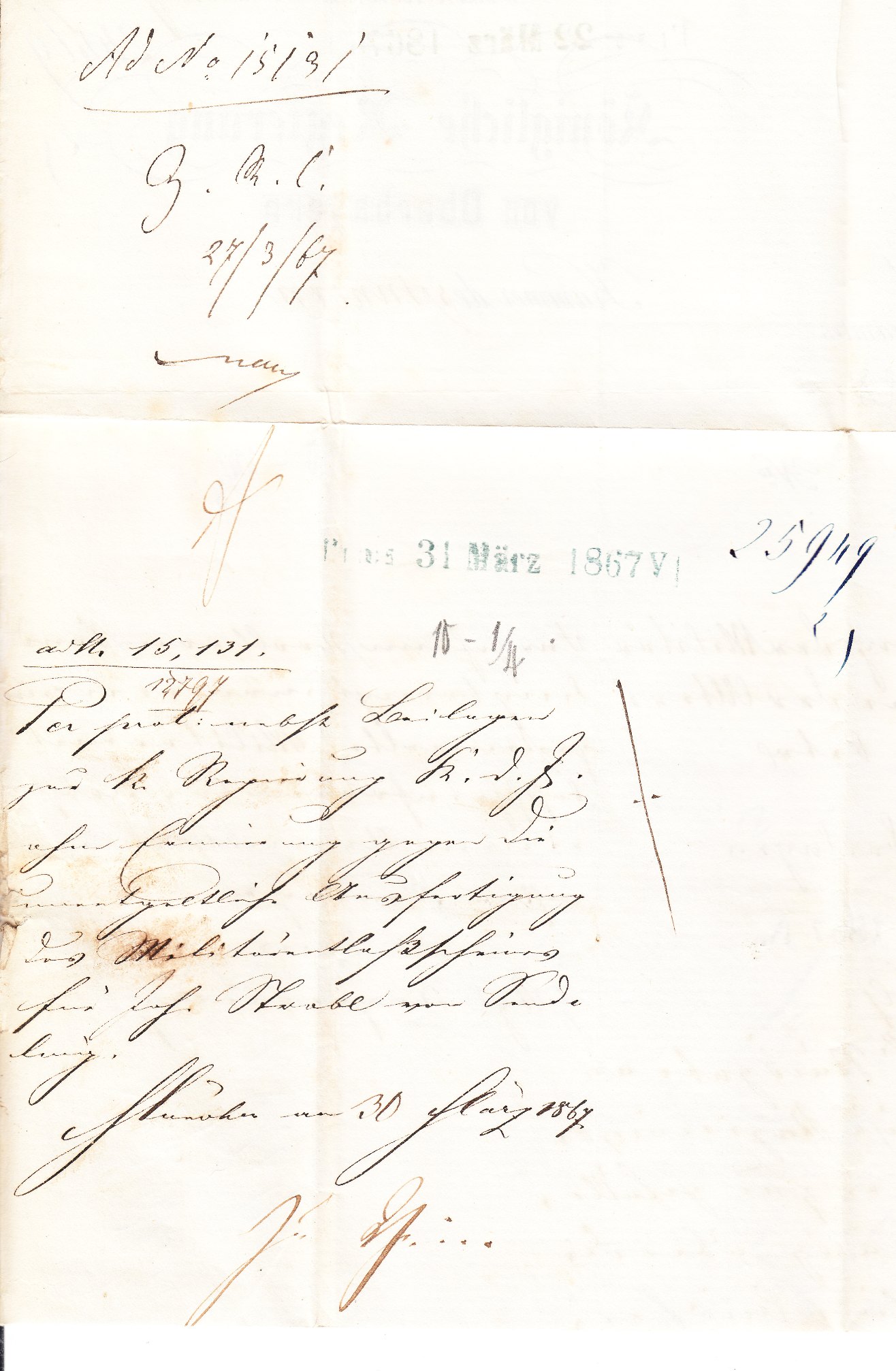 Dieser Brief im Ortsverkehr Münchens wurde am 21.03.1867 in "MÜNCHEN BAHNH." als "R.S." = Regierungssache aufgegeben: