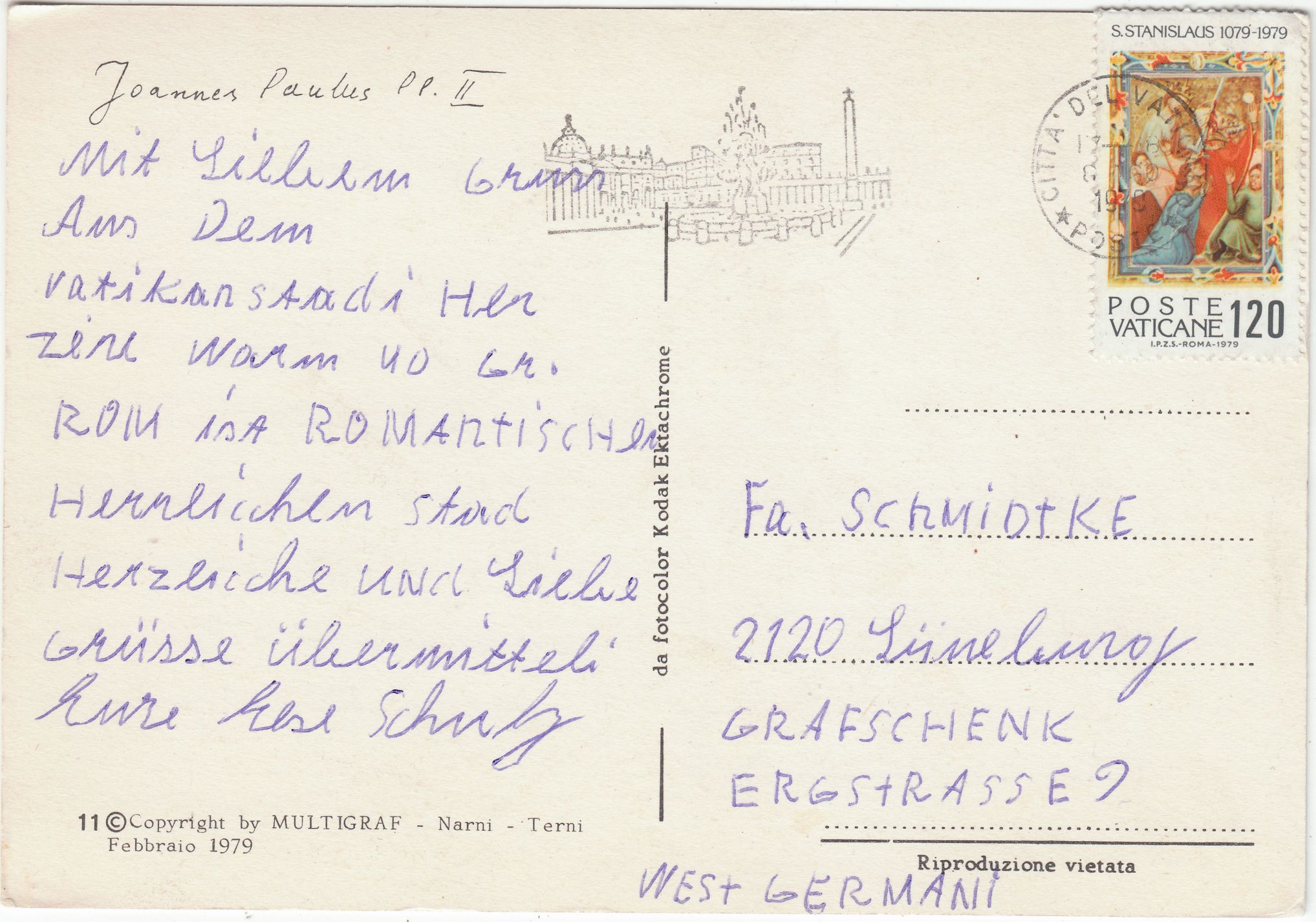 Hier eine Einzelfrankatur eines Postwertzeichens aus dem Vatikan, das 1979 zum Gedenken des 900ten Todestages des Heiligen Sttanislaus erschien: