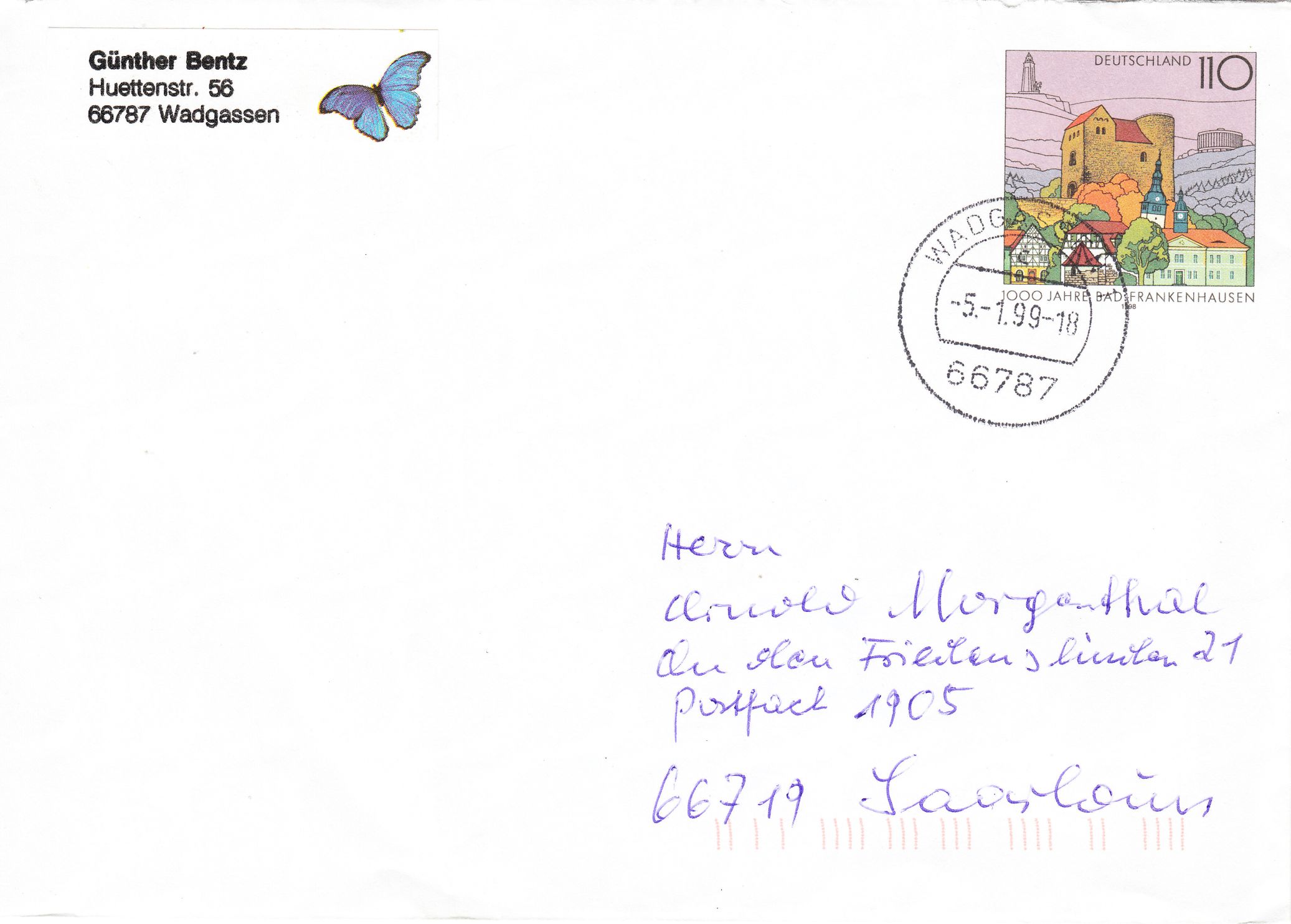 Dieser am 10.06.1998 erschienene erste Plusbrief der DEUTSCHEN POST AG A 001-010, hier blanko entwertet per Tagesstempel der POSTPHILATELIE FRANKFURT AM MAIN, zeigt als Sonderpostwertzeicheneindruck die Ausgabe "1000 JAHRE BAD FRANKENHAUSEN":