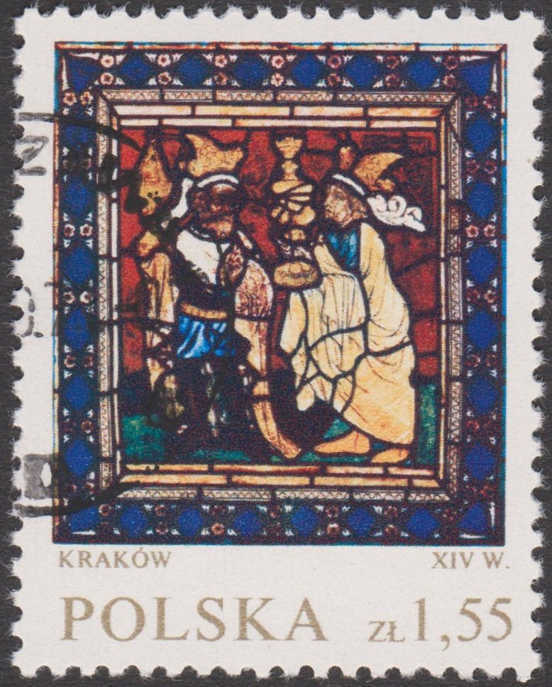Polen MiNr. 2106 zeigt eine Glasmalerei von 1430/1440 aus der Dominikaner-Kirche in Krakau, die zwei Magier darstellt: