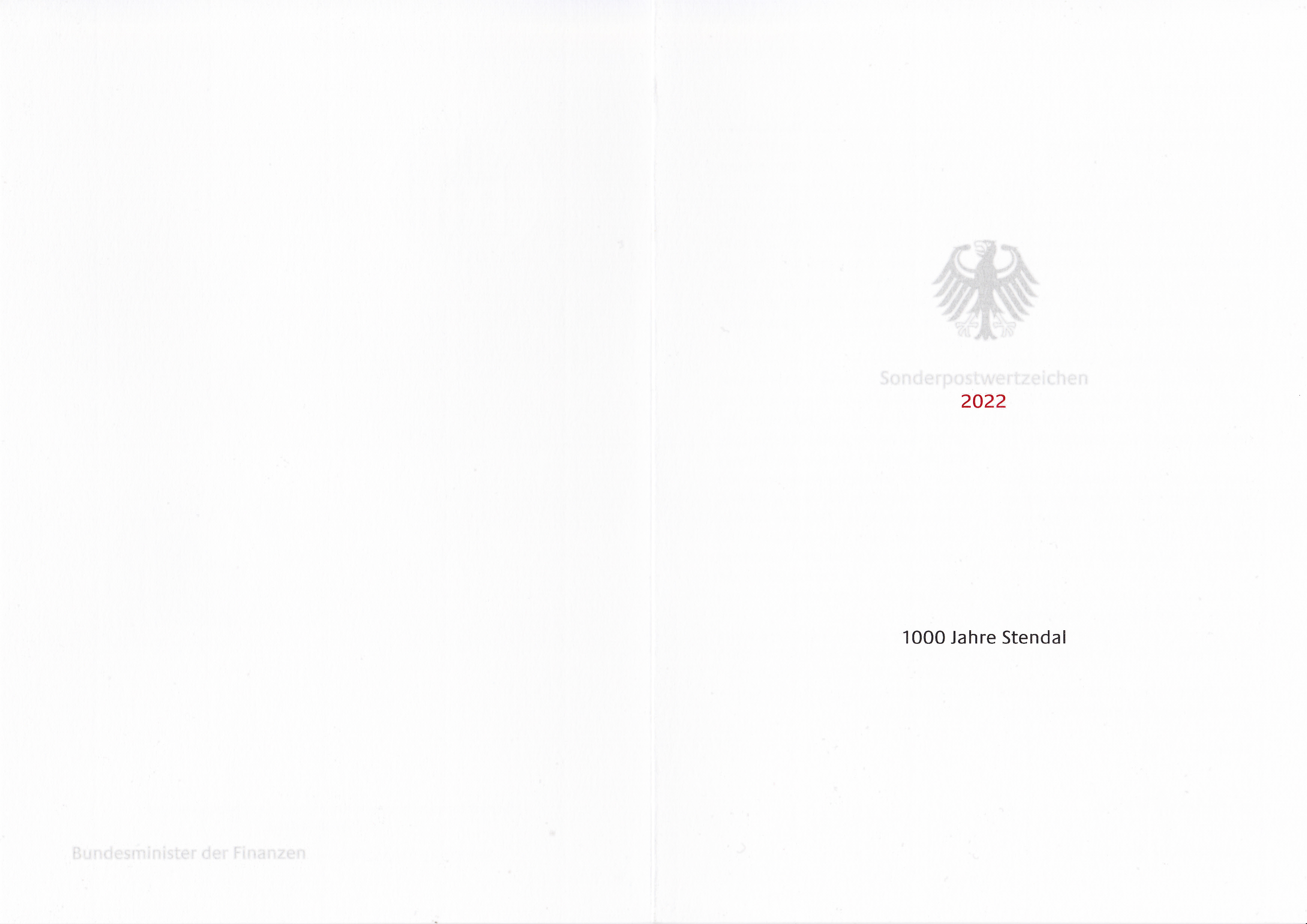 Ministerkarte des Bundesministers für Finanzen mit zwei Marken "1000 Jahre Stendal" (MiNr 3698) mit dem Motiv "Gebäude der Stadt Stendal: Uenglinger Tor, St. Petri, St. Marien mit Rathaus, Roland-Säule, St. Jacobi, Tangermünder Tor" und den beiden Ersttagsonderstempel Bonn und Berlin.