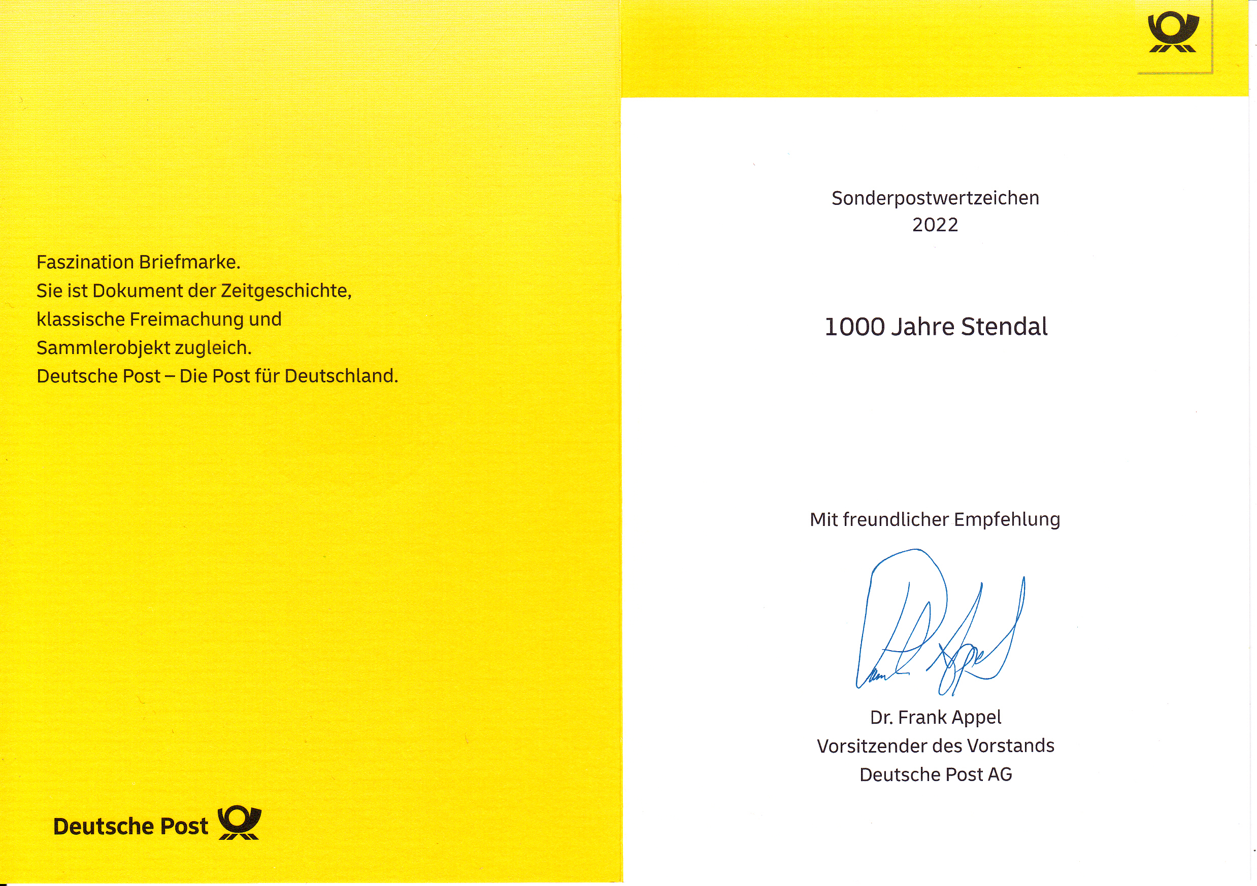 Klappkarte des Vorstandsvorsitzenden der Deutschen Post AG mit der Marke (MiNr 3698) "1000 Jahre Stendal" und dem Ersttagsonderstempel Bonn.