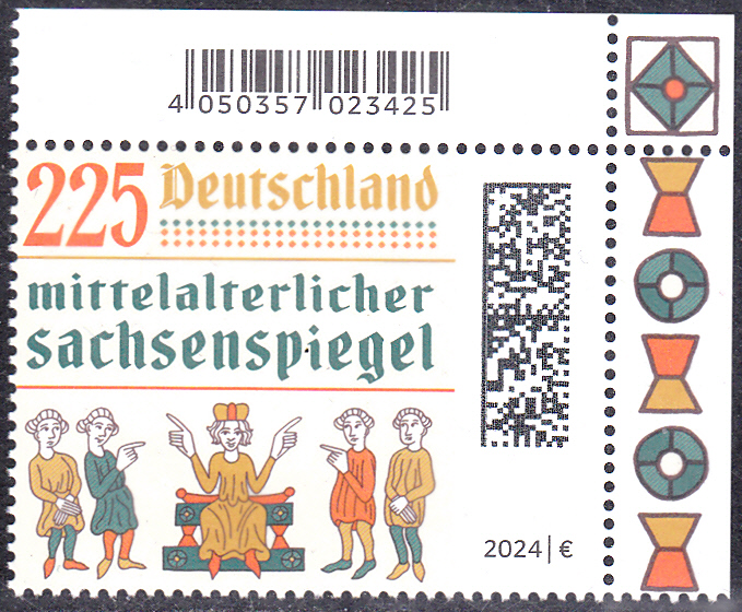 Bei der Deutschen Post ist eine Marke (MiNr 3815) zum Thema "Mittelalterlicher Sachsenspiegel" erschienen. Die Marke zeigt eine Szene einer Verhandlung vor Gericht aus der Heidelberger Bilderschrift. Hier zeige ich ein Eckrandstück mit EAN-Codierung.