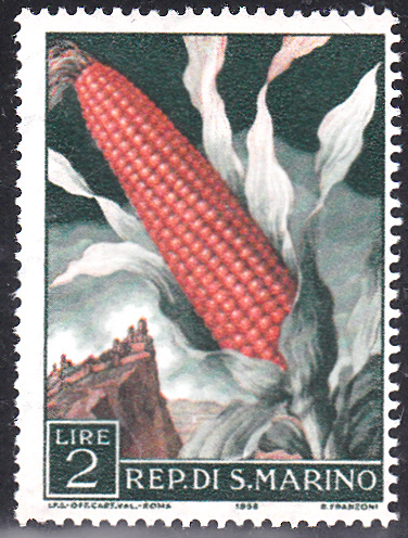 Einen Maiskolben (Zea mays) zeigt uns die Marke aus San Marino (MiNr 595).