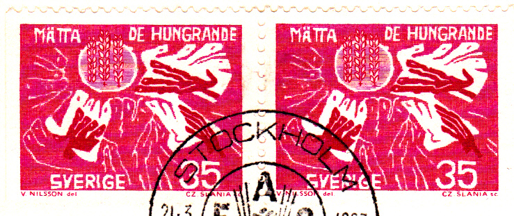 Am 21.März 1963 erschienen in Schweden zwei Marken (MiNr 504/505) zum Thema "Kampf gegen den Hunger". Den 35 Öre-Wert gibt es aus Rollen (senkrecht gezähnt) und aus Markenheftchen (jeweils dreiseitig gezähnt), den 50 Öre-Wert nur aus Rollen. Hier ein Erstagsbrief mit allen Varianten (MiNr 504 A, 504 Dl, 504 Dr, und 505 A)