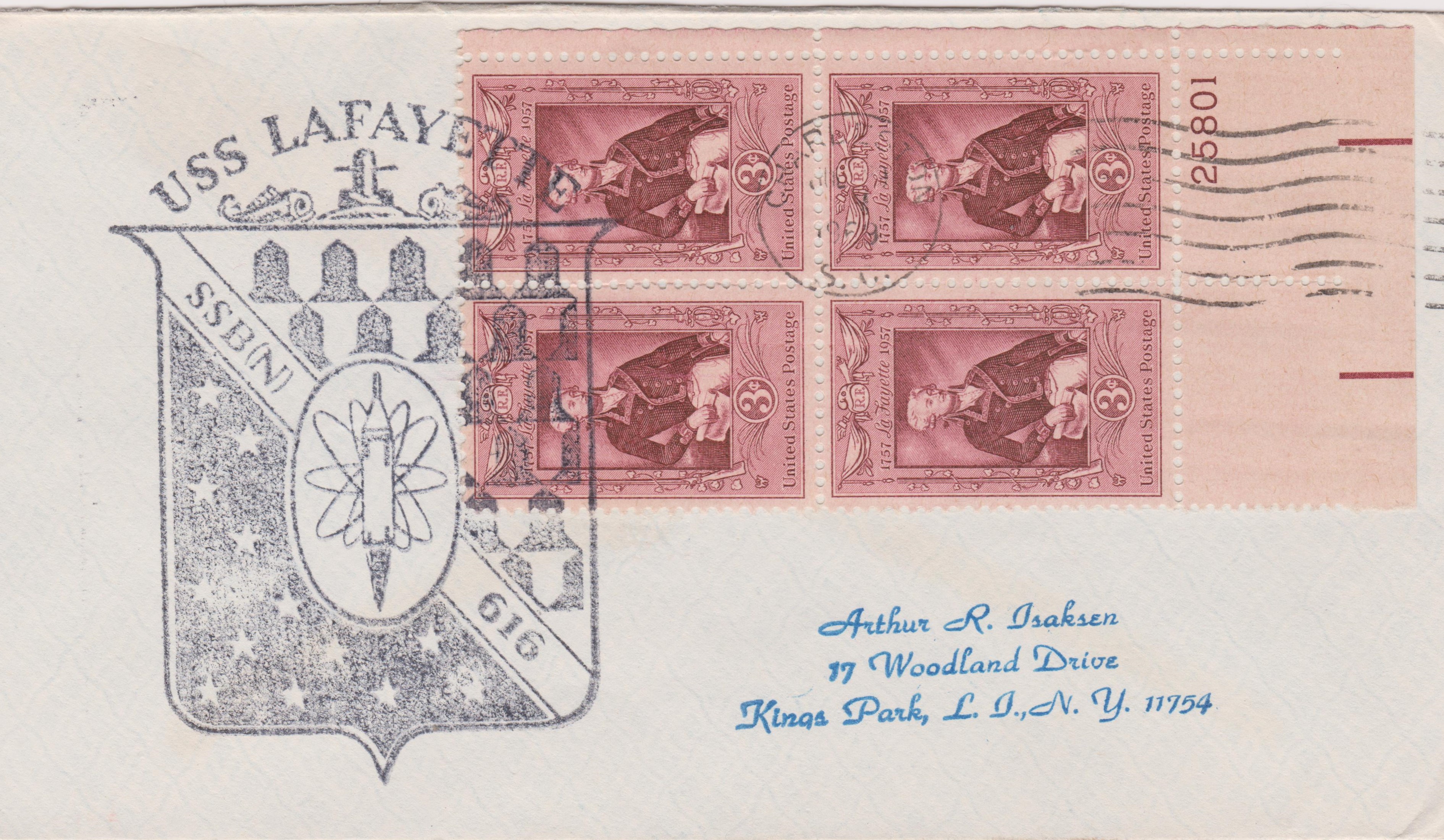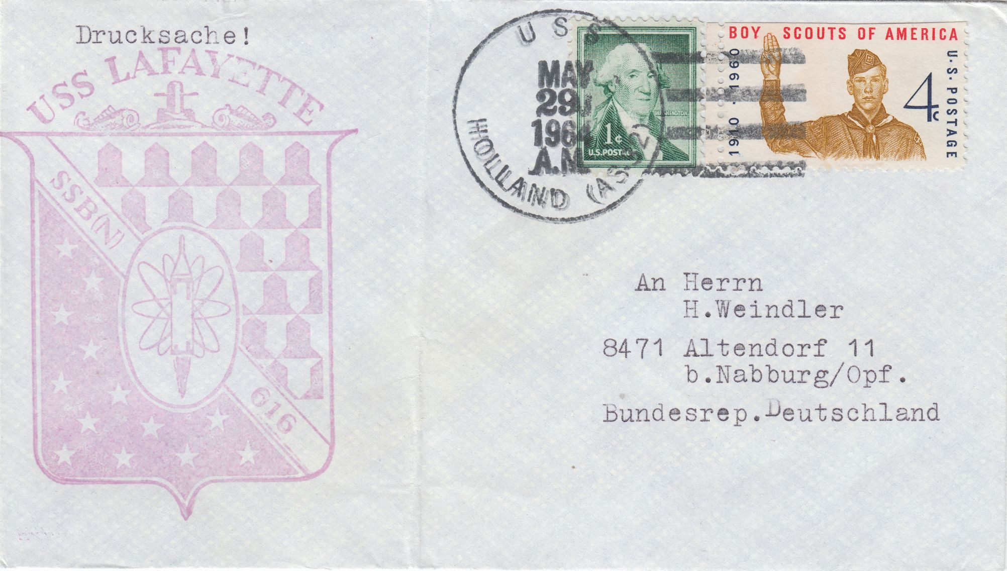 Dieser Beleg vom 29.05.1964 wurde dem U-Boot-Tender USS HOLLAND (AS-32) zur Weiterbeförderung übergeben, wo die Frankatur entwertet wurde: