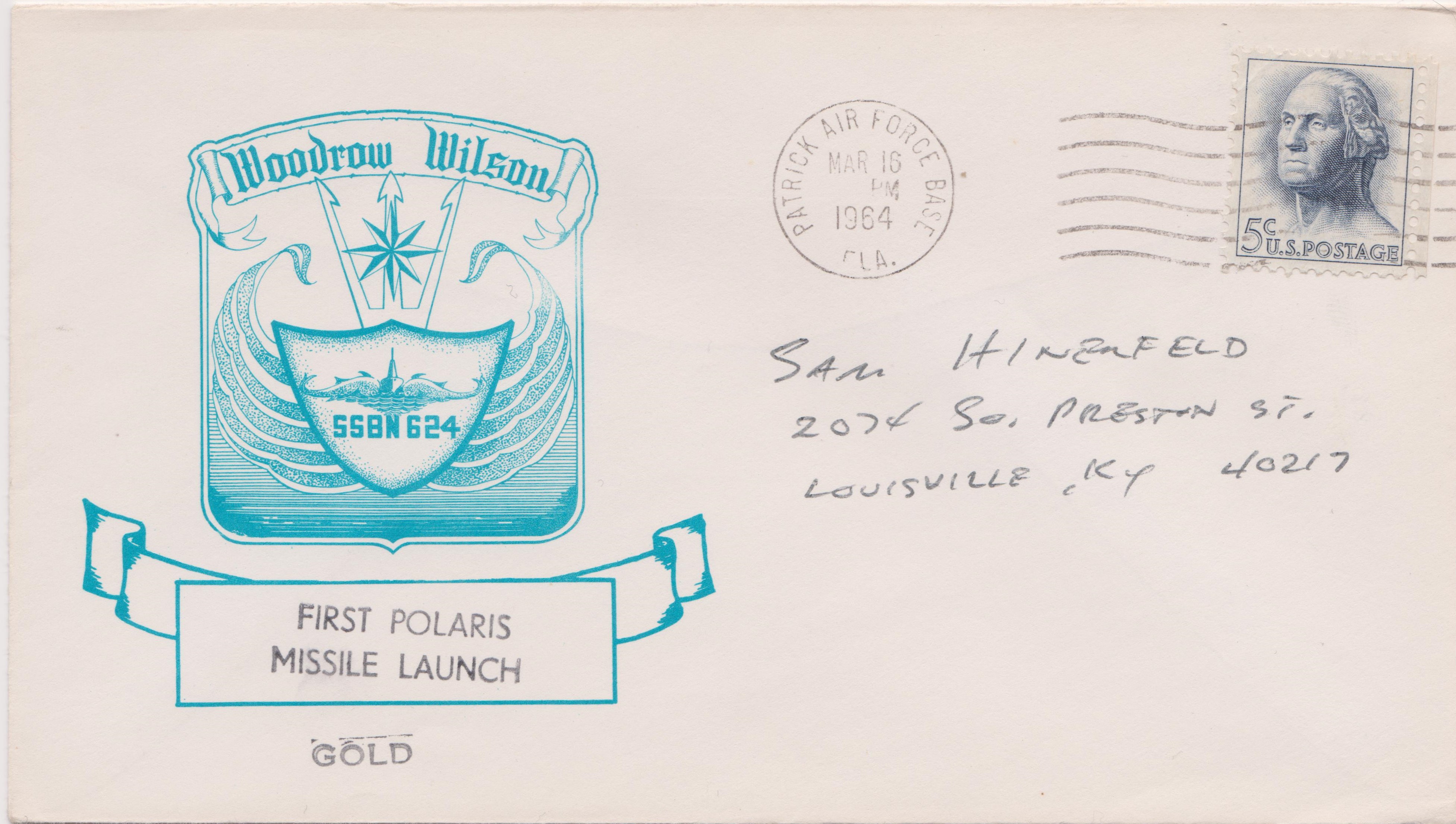 Dieser Beleg vom 16.03.1964 dokumentiert den ersten Start einer POLARIS-Rakete von Bord der USS WOODROW WILSON durch die GOLD Crew.