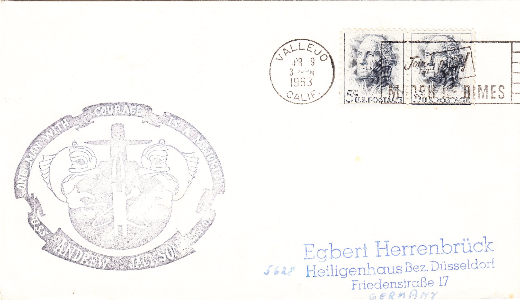 Dieser Beleg vom 09.04.1963 stammt aus der Zeit vor der Indienststellung, die am 03.07.1963 erfolgte. Das U-Boot lag zu dieser Zeit im Mare Island Naval Shipyard, der ersten Werft der United States Navy an der Pazifikküste. Sie befand sich auf Mare Island, Kalifornien. Die nächste Stadt ist Vallejo, direkt gegenüber der im Napa River gelegenen Insel, wo die Frankatur dieses Beleges entwertet wurde.