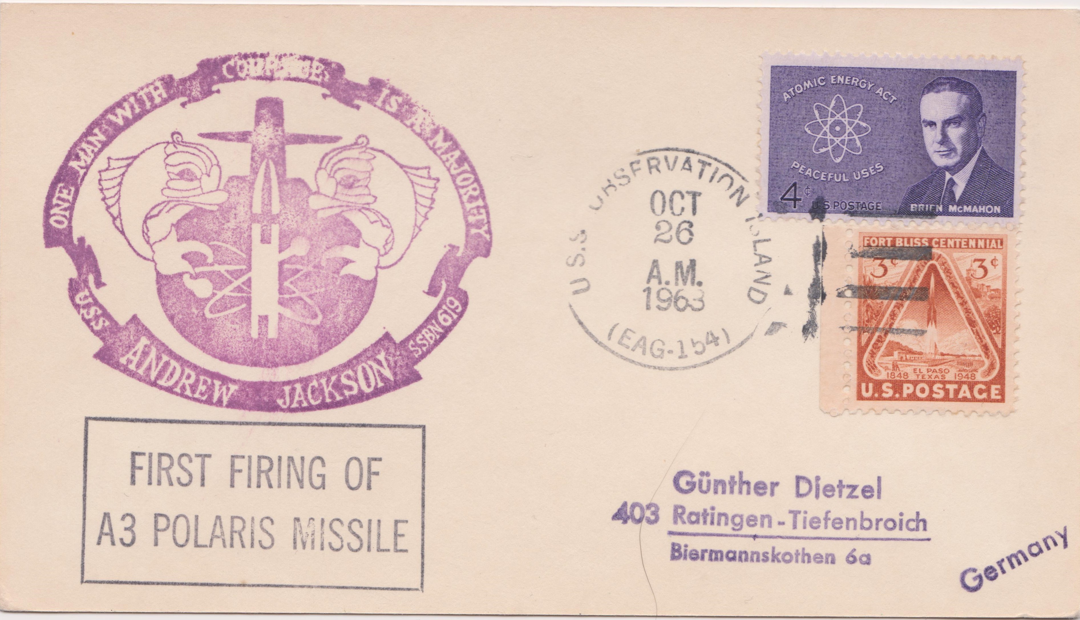 Am 01.10.1963 und 11.10.1963 schoss die USS ANDREW JACKSON (SSBN-619) erfolgreich zwei Testraketen vom Typ UGM-27B Polaris A2 ab, am 26.10.1963 feuerte sie als erste Einheit getaucht die Weiterentwicklung UGM-27C Polaris A3 ab, was dieser am 26.10.1963 via USS OBSERVATION (EAG-154) gelaufene Beleg dokumentiert:
