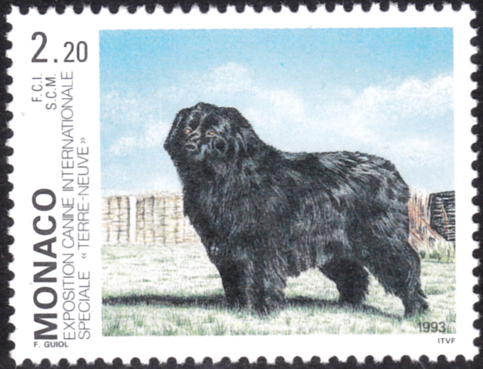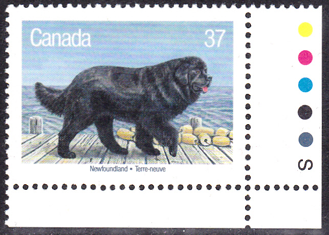 Auf dieser Marke aus Kanada (MiNr 1100) ist ein schwarzer Neufundländer zu sehen.
