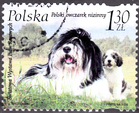 Auf dieser Marke aus Polen (MiNr 4291) sind zwei Polski Owczarek Nizinny zu sehen.