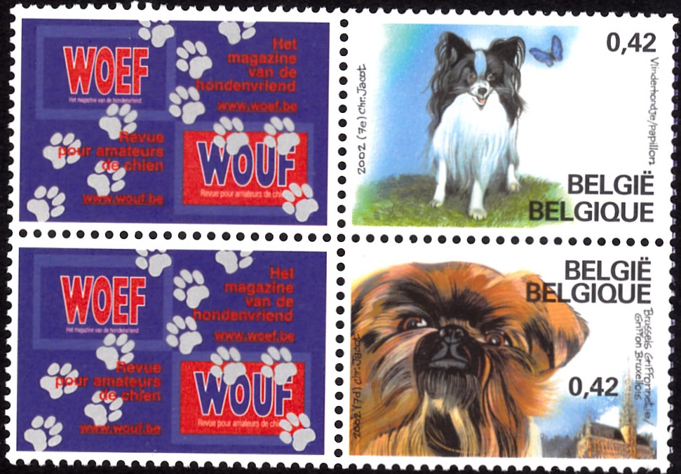Diese Marke wurde mit vier anderen Marken mit Belgischen Rassehunden und jeweils einem Zierfeld in einem Kleinbogen gedruckt. Hier zeigen ich die Marke in einem Viererblock mit einer zweiten Marke und zwei Zierfeldern.