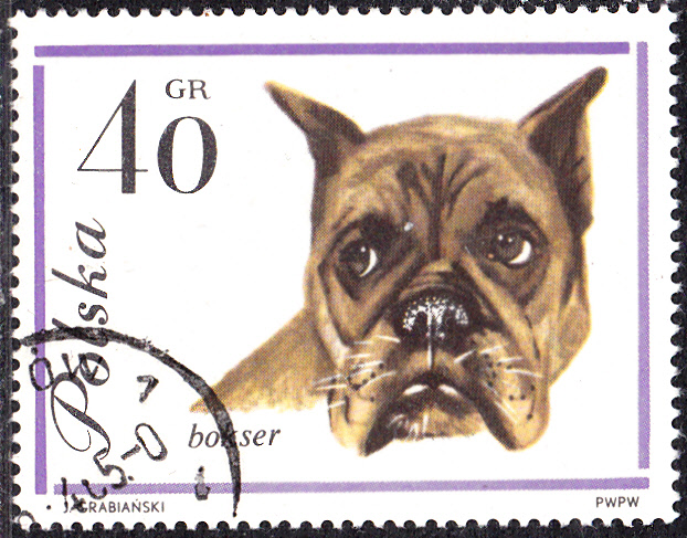 Eine Marke aus Polen (MiNr 1376) zeigt den Kopf eines Boxer im Markenbild.