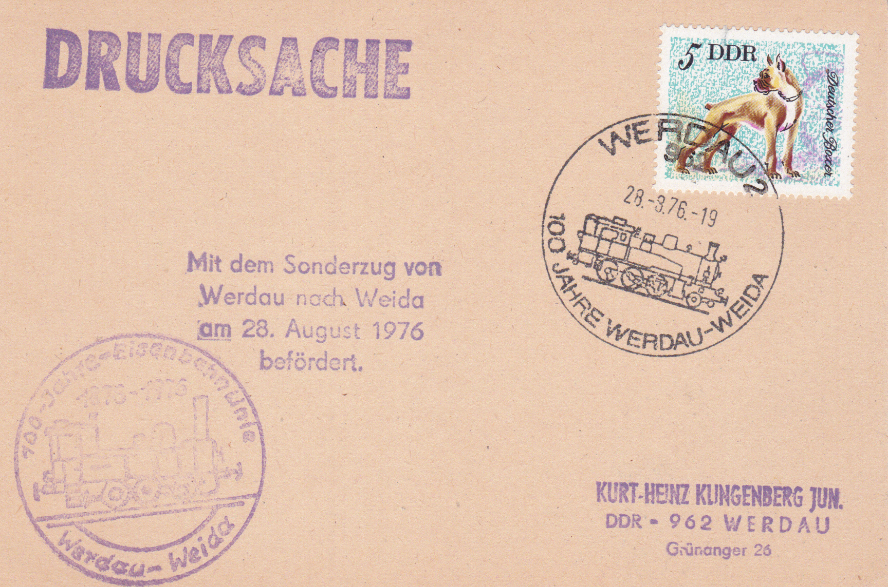 Diese Drucksache mit Einzelfrankatur der Marke aus der DDR zu 5Pf aus der Serie "Hunde" (MiNr 2155) mit einem Deutschen Boxer und einem Sonderstempel aus Werdau vom 28. 8. 1976 zum Jubiläum "100 Jahre Bahnstrecke Werdau-Weida wurde mit dem Sonderzug von Werdau nach Weide am 28. August befördert.