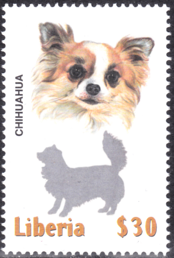 Auf dieser Marke aus Liberia (MiNr 916 A) ist der Kopf eine Langhaar Chihuahua zu sehen.