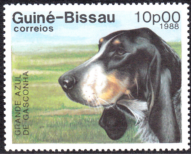 Hier eine Marke aus Guinea-Bissau (MiNr 960) mit dem Kopf eines Grand Bleu de Gascogne.