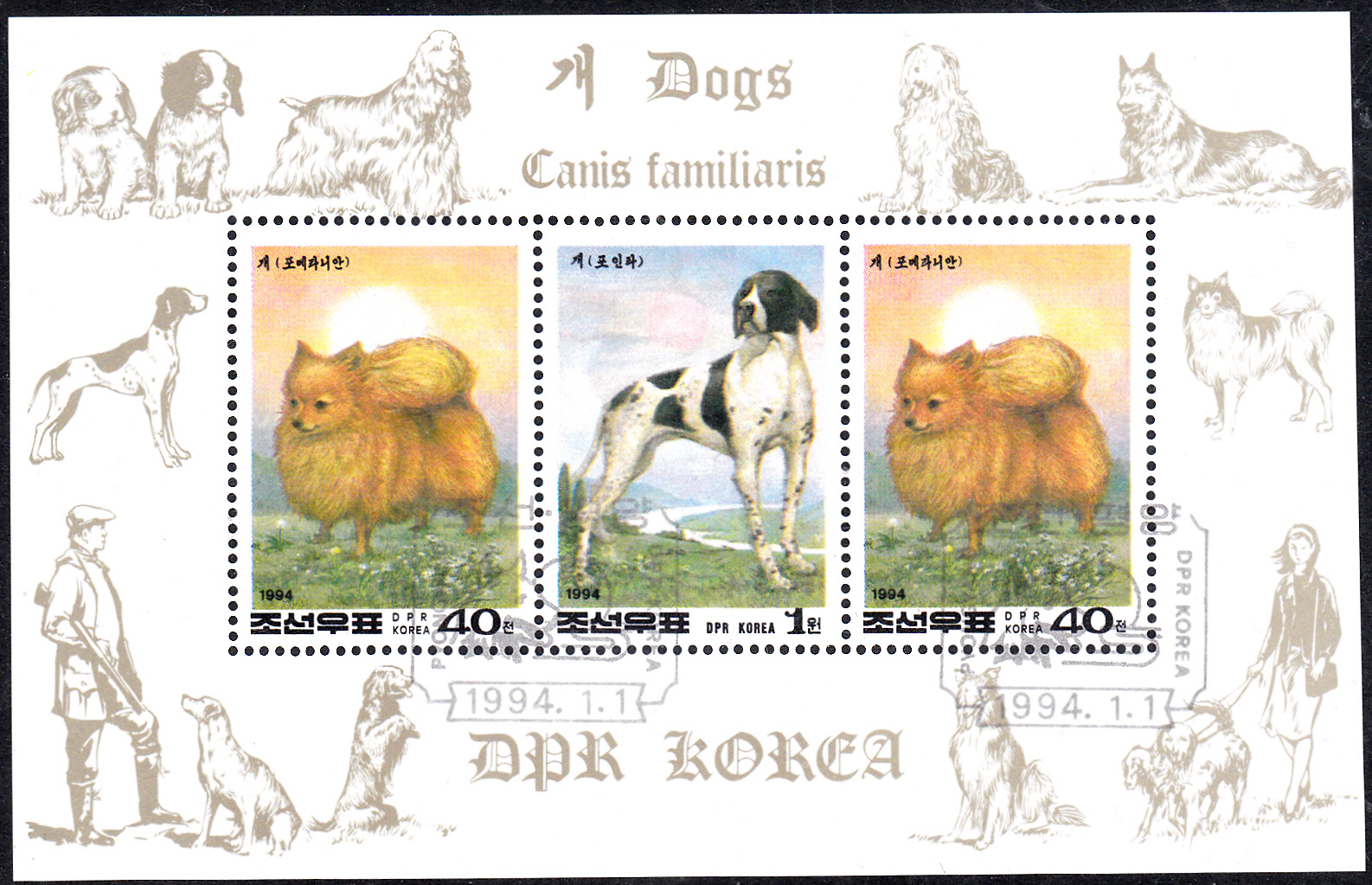 Diese Marke aus Korea-Nord (MiNr 3510) wurde auch zusammen mit einer Marke mit einem English Pointer (MiNr 3512 A)in einem Kleinbogen gedruckt.