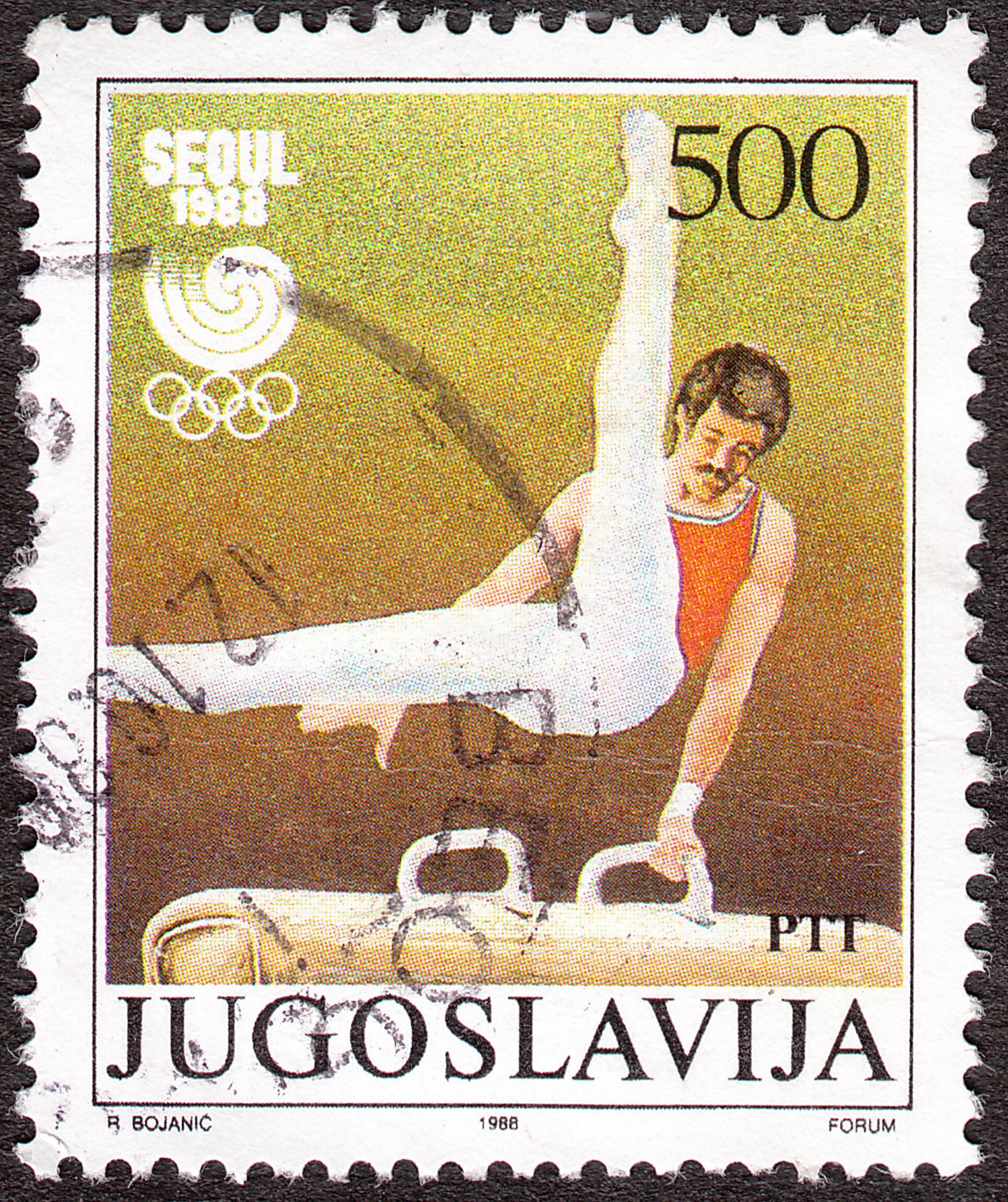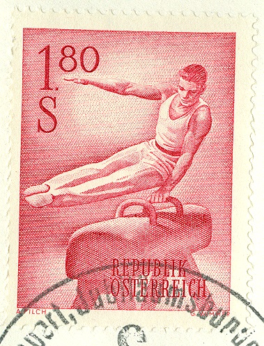Eine Marke der DDR-Ausgabe zeigt einen Sportler am Seitpferd. Die MiNr. 709 (20 + 10 Pfennig, lilarot) erschien am 10. August 1959 anlässlich eines Turn- und Sportfestes in Leipzig/Sachsen.