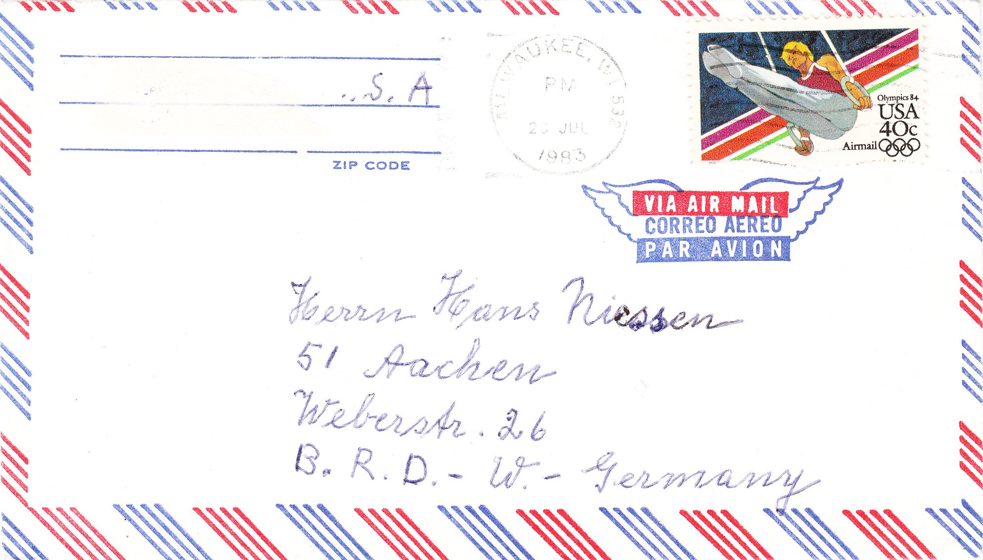 Ein Ringeturner aus den USA als Motiv auf einem zur Olympiade 1984 ausgegebenen Postwertzeichen, am 26.07.1983 als EF gebraucht auf einem Luftpostbrief nach Deutschland: