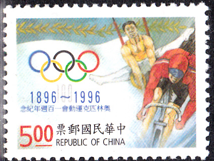 Auf dieser Marke aus Taiwan (MiNr 2306) aus Anlass "100 Jahre Olympische Spiele" wird neben den Olympischen Ringen, einem Radrennfahrer auch ein Turner an den Ringen gezeigt.