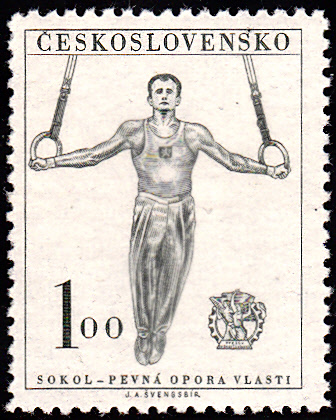 Diese Marke aus der Tschechoslowakei (MiNr 671) zeigt einen Turner an den Ringen bei einem "Kreuzhang".