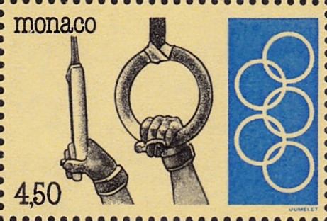 Auf dieser Marke aus Monaco (MiNr 2142) werden nur die beiden Ringe mit den Händen des Turners gezeigt.