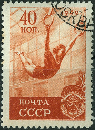 Auf dieser Blockmarke der ehemaligen CCCP ist ein solcher Ringeturner als Motiv verewigt worden.