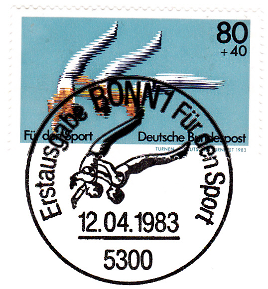Die 80Pf+40Pf-Marke "Für den Sport" 1983 erschien zum Deutschen Turnfest in Frankfurt am Main und zeigt im Markenbild einen Turner beim Sprung in verschiedenen Phasen. Hier ein Exemplar der Marke mit dem dazu passenden Ersttagsonderstempel aus Bonn.