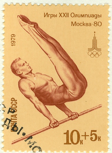 In der Sowjetunion erschien 1957 eine Serie "Erfolge sowjetischer Sportler bei den Olympischen Sommerspielen 1956 in Melbourne". Hier eine Marke dieser Serie (MiNr 1969) mit einem Turner am Reck.