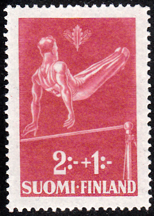 Auf dieser Marke aus Finnland (MiNr 287) aus einer Serie "Sport" wird ein Turner am Reck gezeigt.