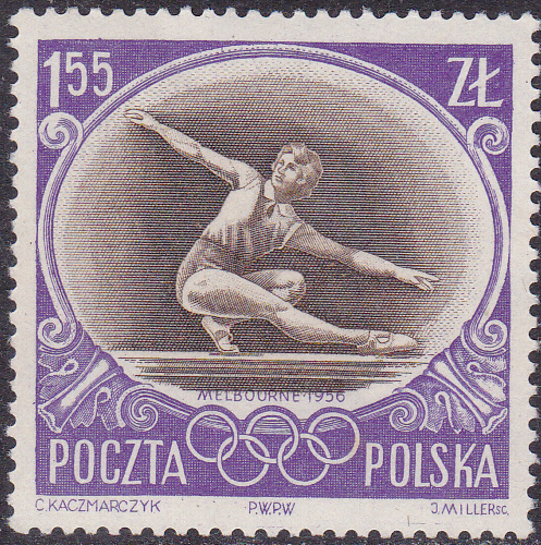 In Polen ist zu den Olympischen Spiele 1956 in einer Serie diese Marke (MiNr 989) mit einer Turnerin am Stufenbarren erschienen.