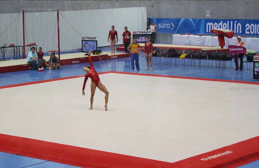 "Als Bodenturnen bezeichnet man eine Turndisziplin. Beim Bodenturnen ist die Wettkampffläche 12 x 12 m groß und besteht aus einer leicht federnden Unterkonstruktion mit darauf liegenden Deckläufern.