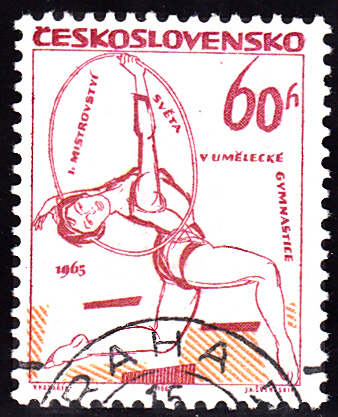 Zur 1. Weltmeisterschaften in der Rhythmischen Sportgymnastik ist in der Tschechoslowakei diese Marke (MiNr 1505) mit einer Turnerin bei einer Übung mit dem Reifen.