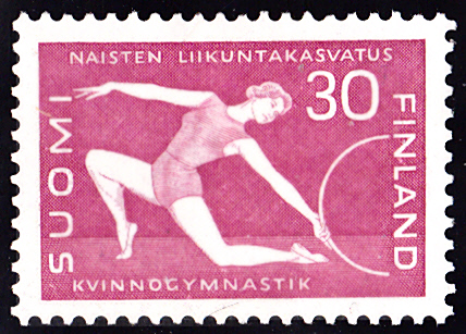 Diese Marke zum 100. Geburtstag von Elin Kallio zeigt sie bei einer Übung mit dem Reifen.