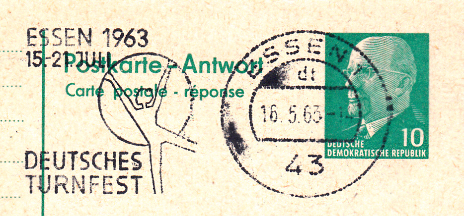 Der Stempelabdruck ist auf einem Ulbricht-Wertstempel einer DDR-Ganzsache zu sehen. Es handelte sich ursprünglich um eine Postkarte mit Antwortkarte, die in die Bundesrepublik verschickt worden war und dann wurde mit dem Antwortteil der Karte zurückgeschrieben und die Antwortkarte in Essen gestempelt. Leider hat ein Vorbesitzer den Stempel ausgeschnitten.