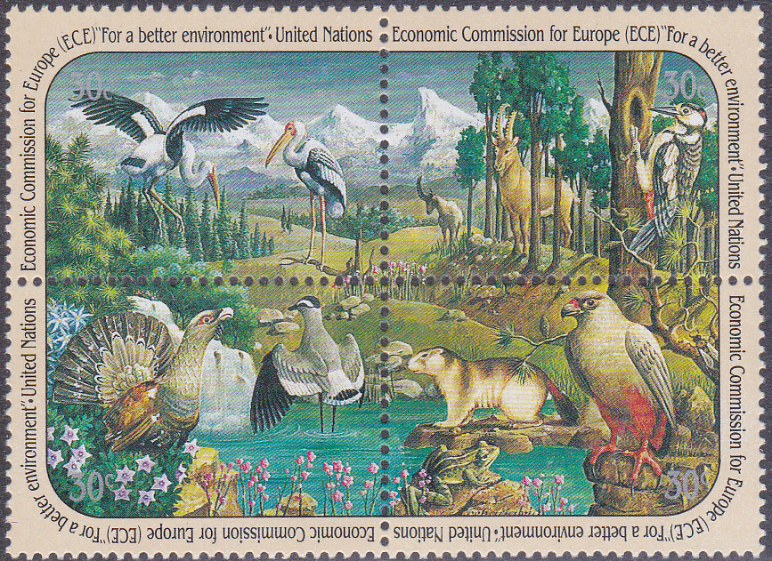 Diese Marke wurde zusammen mit drei weiteren Marken als Viererblock gedruckt und ergeben zusammen ein Bild der Fauna und Flora eines Bergsees.