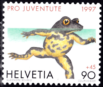 Auf einer Marke aus der Schweiz (MiNr 1631) ist ebenfalls eine Gelbbauchunke (Bombina variegata) abgebildet.