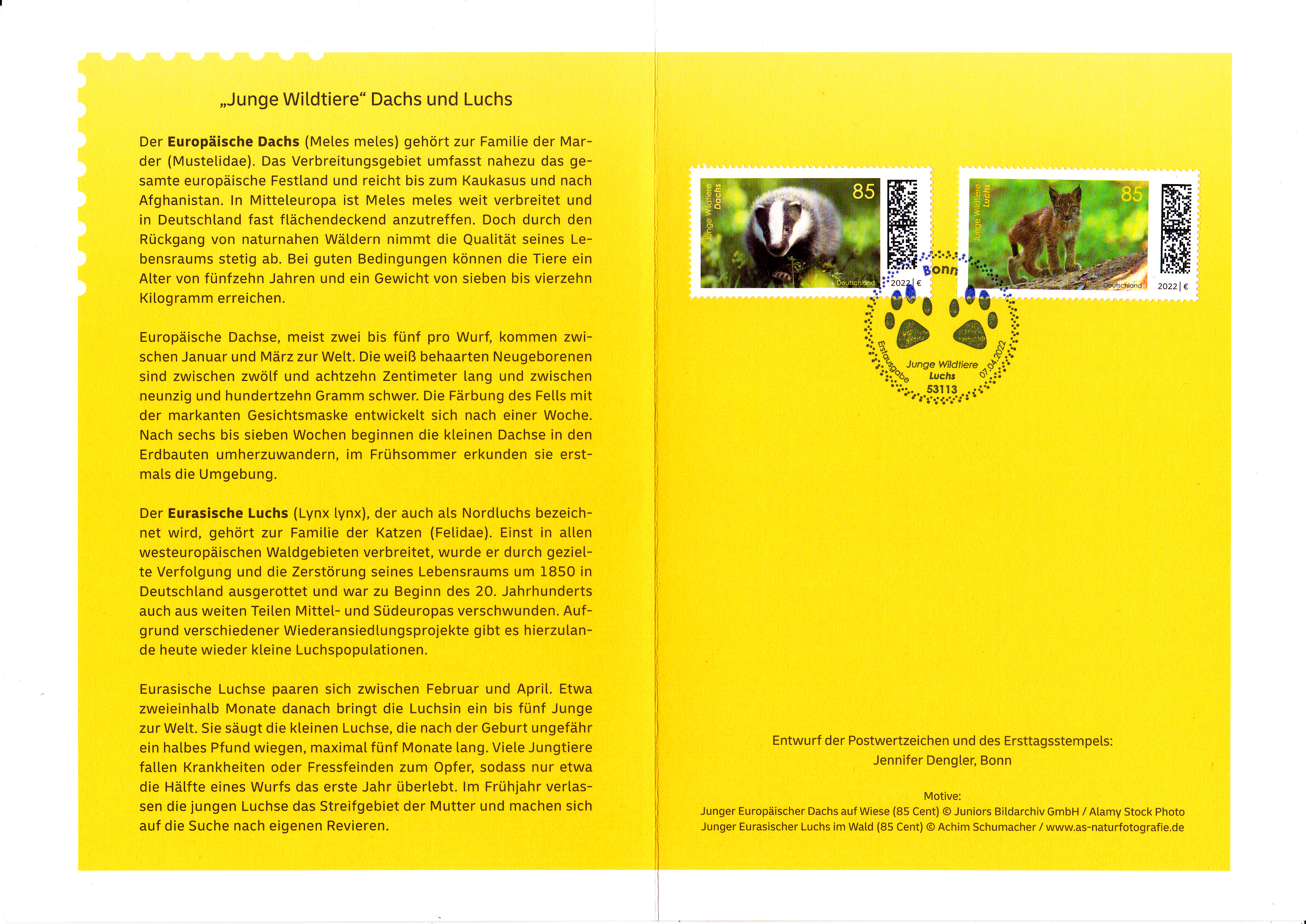 Klappkarte des Vorstandsvorsitzenden der Deutschen Post AG je einer Marke der Serie "Tierbabys" (MiNr 3681/3682) mit Motiven "Europäischer Dachs (Meles meles)" und "Eurasischer Luchs (Lynx lynx)" und dem Ersttagsonderstempel Bonn.