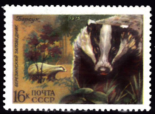 Diese Marke mit einem Dachs (Meles meles) stammt aus der Sowjetunion (MiNr 4399).