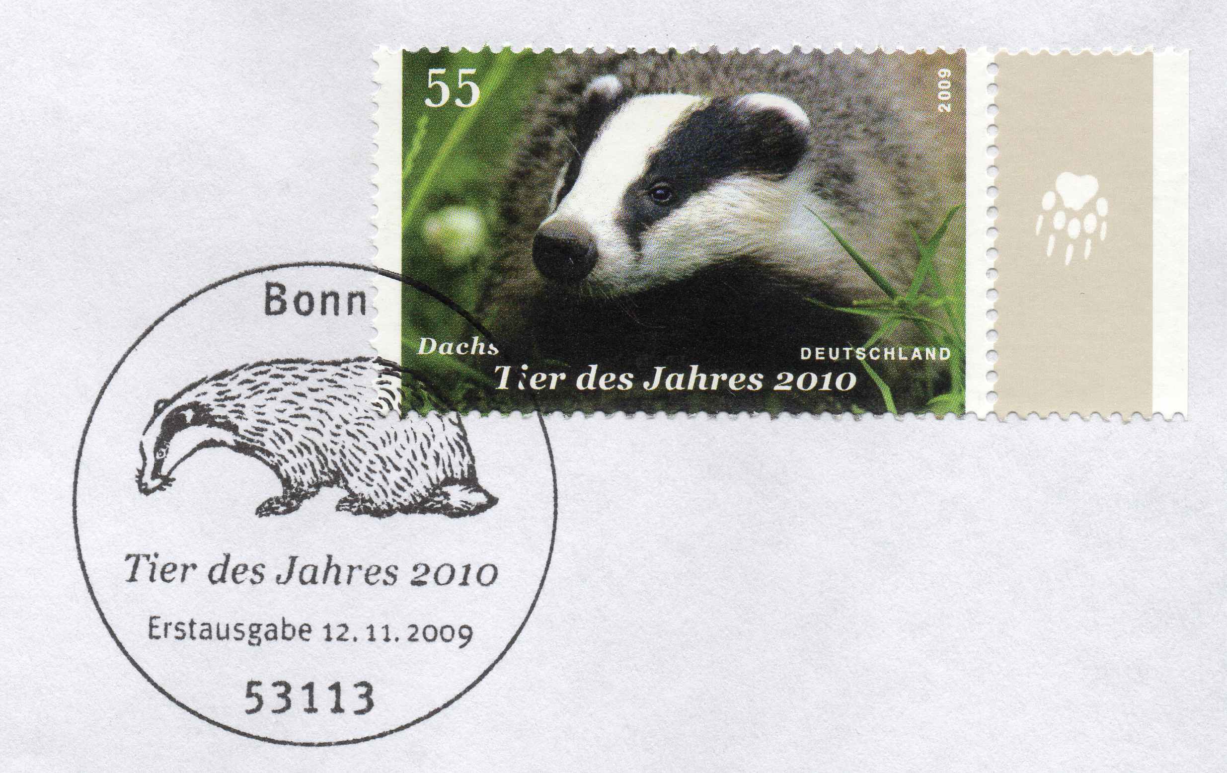 Als der Dachs (Meles meles) 2010 Tier des Jahres war, ist bei der Deutschen Post auch eine Marke (MiNr 2767) mit einem Dachs erschienen. Als Wertstempel einer Ganzsache wurde das Motiv vereits hier gezeigt, jetzt folgt eine Marke: