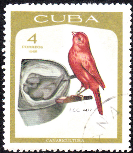 Aus einer Serie "Kanarienvogelzucht" aus Kuba stammt diese Marke (MiNr 1394) mit einem preisgekrönte Kanarienvögel. Auf der Marke ist vermutlich seine "Registriernummer" angegeben.