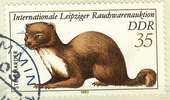 Die "Internationale Leipziger Rauchwarenauktion" war 1982 der Anlass für die Deutsche Post der DDR eine Markenausgabe mit Motiven von "Pelztieren" herauszugeben. Der 35 Pfennig-Wert zeigt einen Steinmarder. Die Ausgabe hatte am 23. Februar 1982 Ersttag.