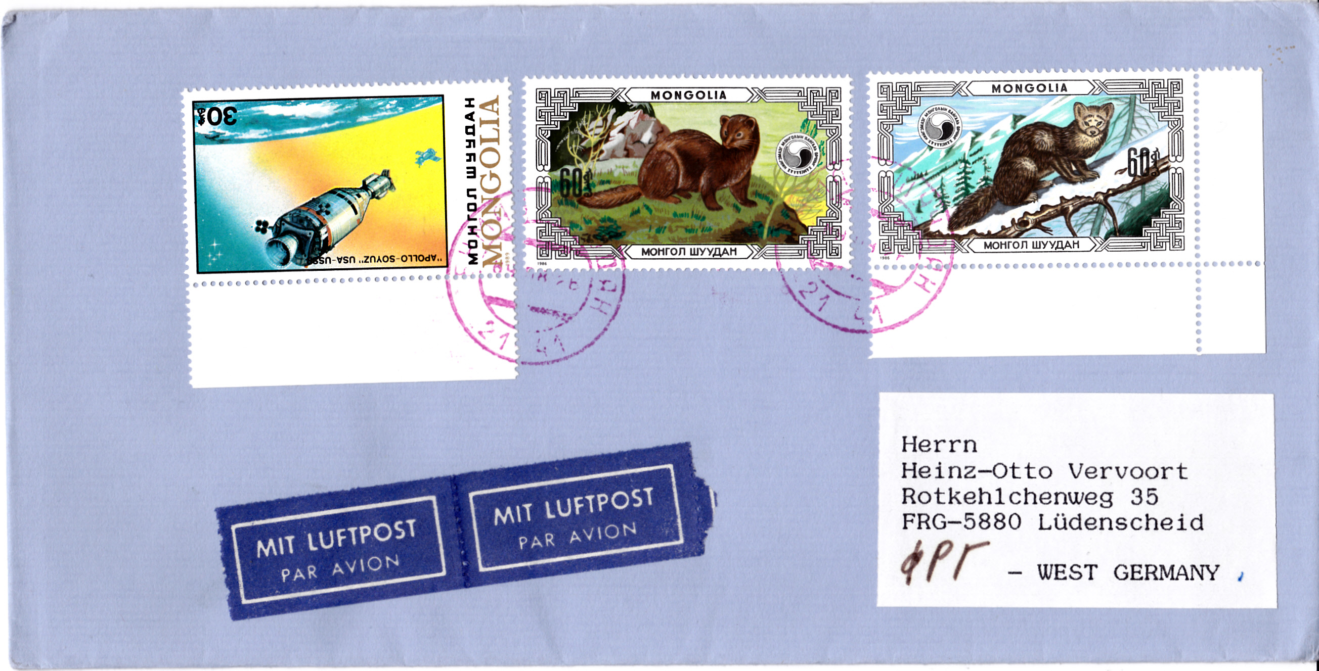 Die beiden gezeigten Marken der Mongolei wurden auf diesem Brief zur Frankatur verwendet.