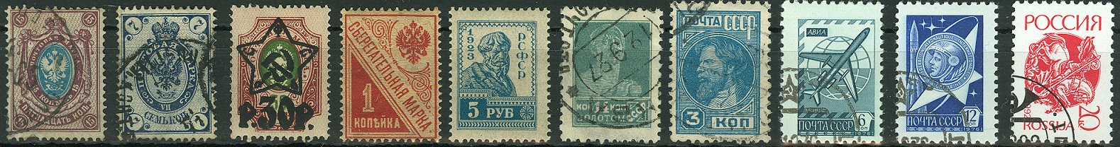 Die Reihe zeigt Freimarken des Zaristischen Rußlands (im MICHEL "Kaiserreich"), der RSFSR, der Sowjetunion (CCCP) und der Rusischen Föderation (ab 1992).