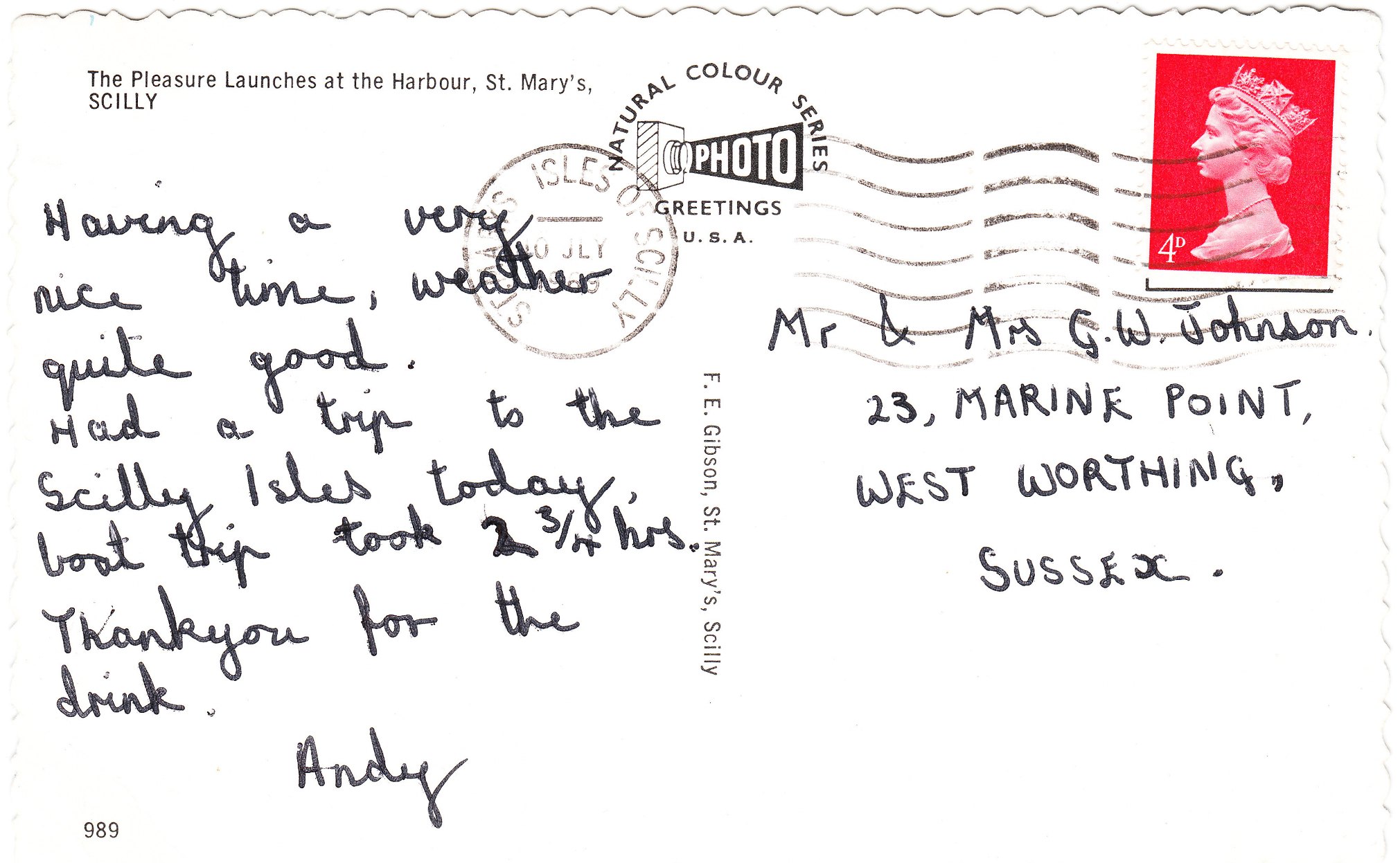 Diese Ansichtskarte wurde am 10.07.1969 auf der Insel St. Mary`s aufgegeben und die Frankatur wurde per Maschinenstempel entwertet: