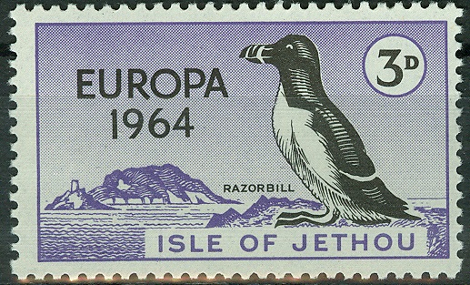 Diese beiden 1963 herausgegebenen Marken zeigen einen Tordalk = englisch "razorbill":