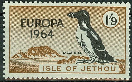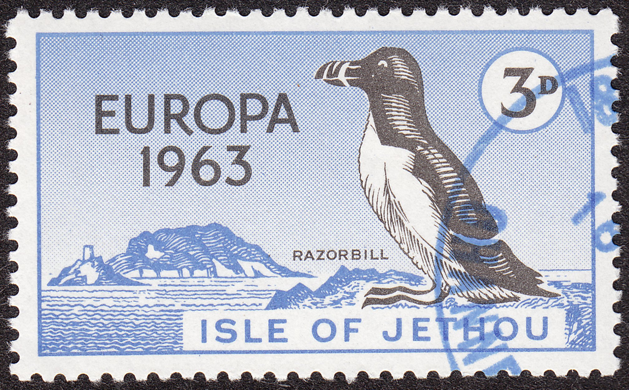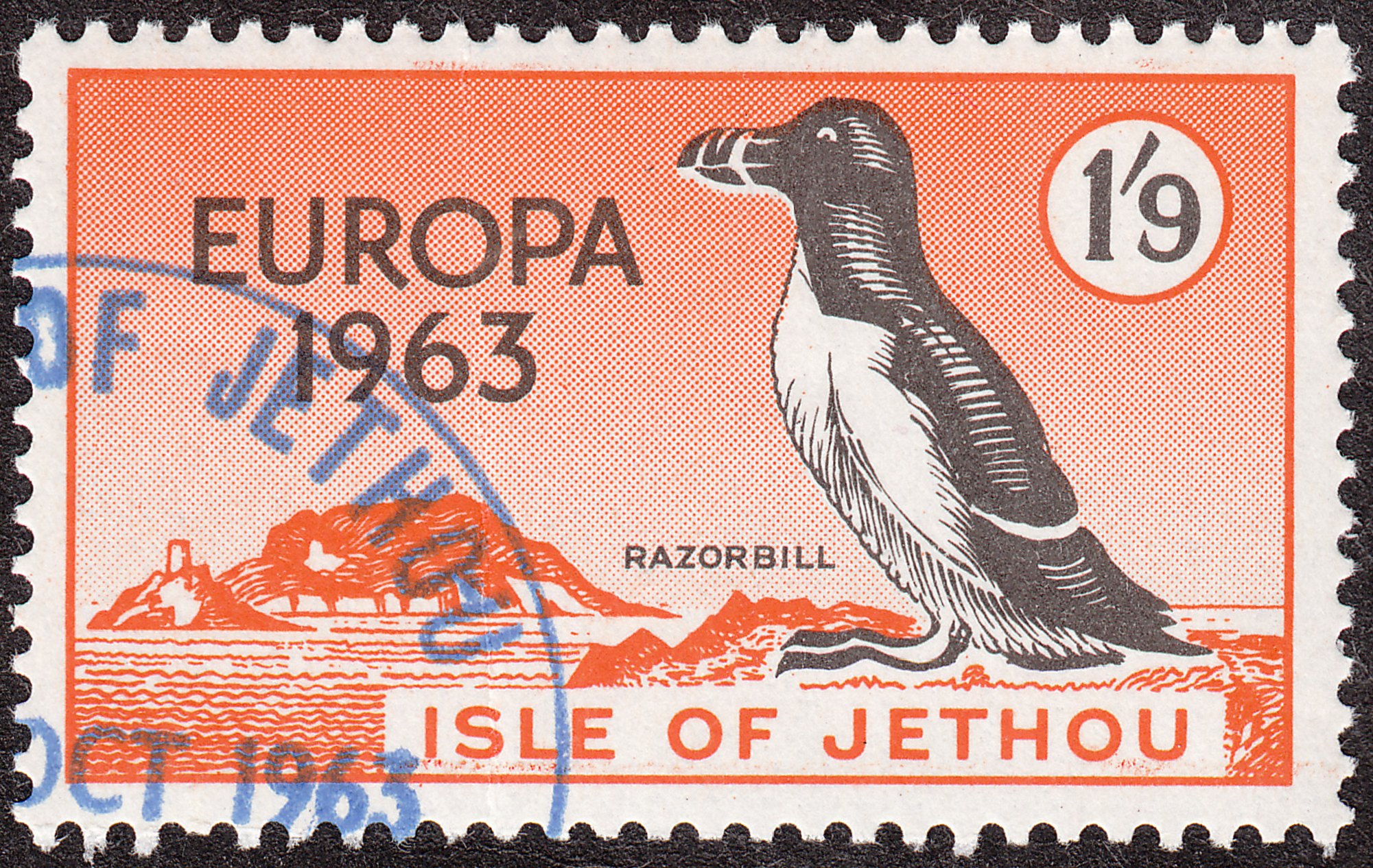 Diese beiden 1963 herausgegebenen Marken zeigen einen Tordalk = englisch "razorbill":
