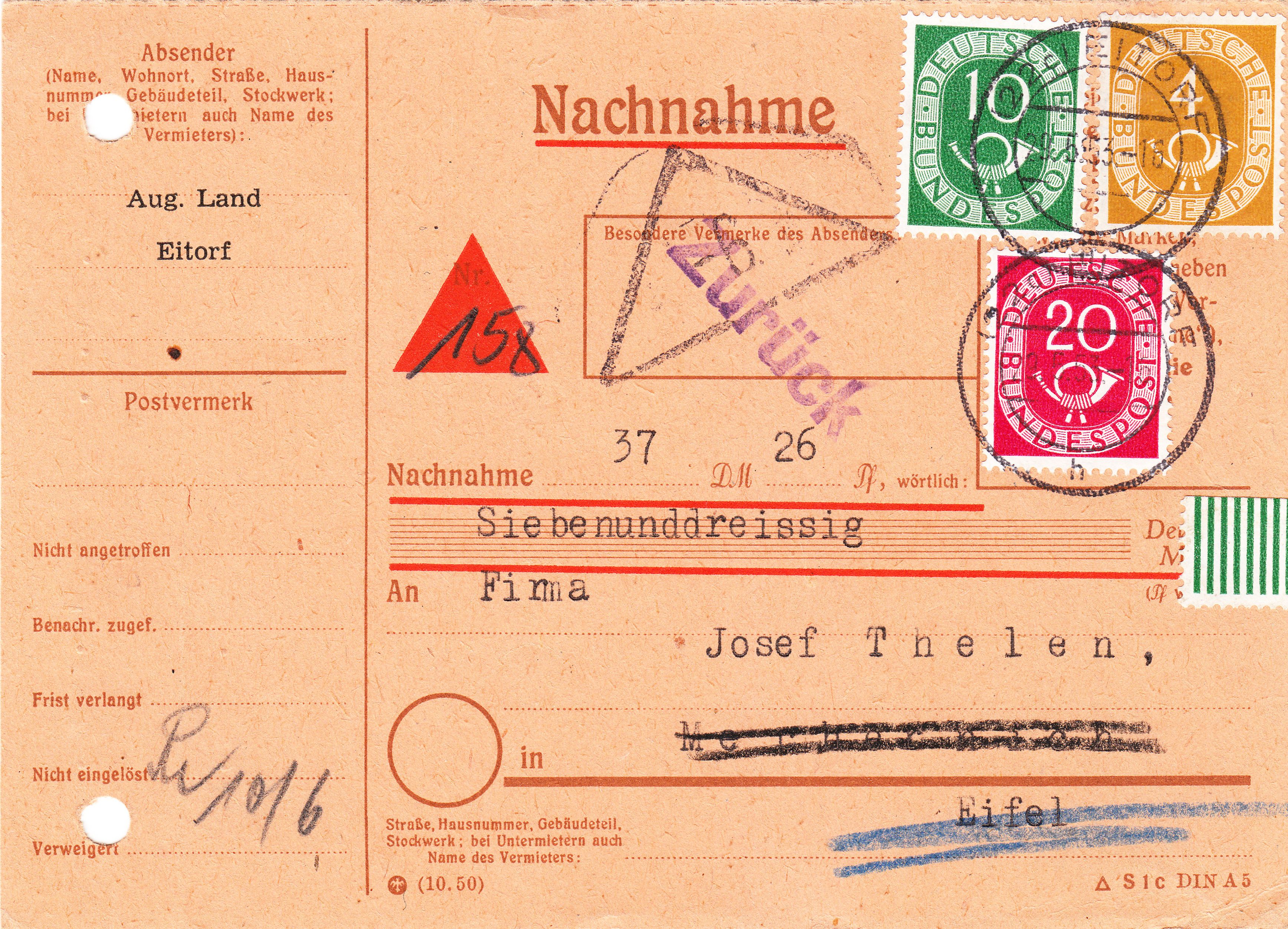 Auch diese Nachnahme wurde vom Empfänger nicht eingelöst und ging nach Ablauf der Lagerfrist am 10. 06.1953 an den Absender "Zurück".